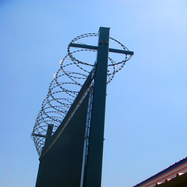 監(jiān)獄隔離網(wǎng)是一種新型防護(hù)網(wǎng),也叫Y型刀片護(hù)欄網(wǎng),它由銳利尖角鍍鋅鋼板或不銹鋼薄板做成刀片刺網(wǎng),鋼絲做芯線組合而成的監(jiān)獄圍墻防護(hù)利器!監(jiān)獄隔離網(wǎng)具有嚇阻、防翻越等效果。監(jiān)獄隔離網(wǎng)可平地安裝,也可在圍墻上二次安裝,有效防止攀逃。直刺式刺網(wǎng)隔離帶,是用柱體和普通刺繩橫、縱、斜向交叉綁定成刺網(wǎng)隔離帶。 監(jiān)獄隔離網(wǎng)的材質(zhì)堅(jiān)硬,具有高強(qiáng)度,高張力,造型設(shè)計(jì)獨(dú)特,不宜觸摸,因而能達(dá)到極好的防護(hù)隔離效果。