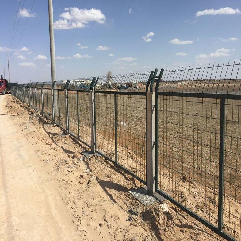 應按圖紙所示安設,牢固地安裝在立柱或支撐上;金屬網應伸展拉緊,整個結構不得扭曲。在進行護欄網施工時,一般應順著地形設置。必要時,需進行土工整平,以取得整齊的外觀。在低洼地區,當地面縱剖面發生突變,無法保持規定的離地凈高時,可使用較長的立柱,然后拉上多股帶剌鐵絲。芾剌鐵絲之間的垂直凈空等于或小于150MM。在開挖或鉆孔之后,所有立柱應按批準的方法埋設。立柱-般每隔120M應在其兩側加斜撐,以保證其穩定性;如果跟據施工要求鐵路防護柵欄在改變方向的地方,立柱應設三向斜撐。