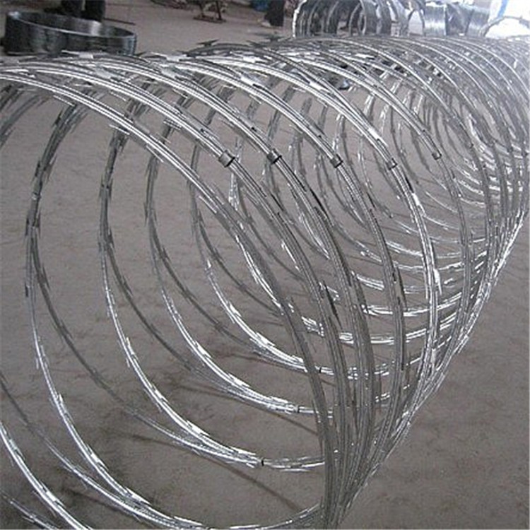 刀片刺絲又名刮刀型刺絲,是一種近年發(fā)展起來(lái)的防護(hù)、隔離能力較強(qiáng)的新型防護(hù)網(wǎng)產(chǎn)品。它采用鋼板沖壓成型包附于鋼絲(筋絲)之上,由銳利尖角鍍鋅鋼板或不銹鋼薄板做刀片,高張力鋼絲做芯線組合而成的。鋒利的刀型刺由雙線扣裝后成蛇腹?fàn)睿让烙^又讓人不寒而粟。起到了很好的阻嚇作用。該產(chǎn)品具有美觀、防阻效果好、施工便利等優(yōu)點(diǎn)。